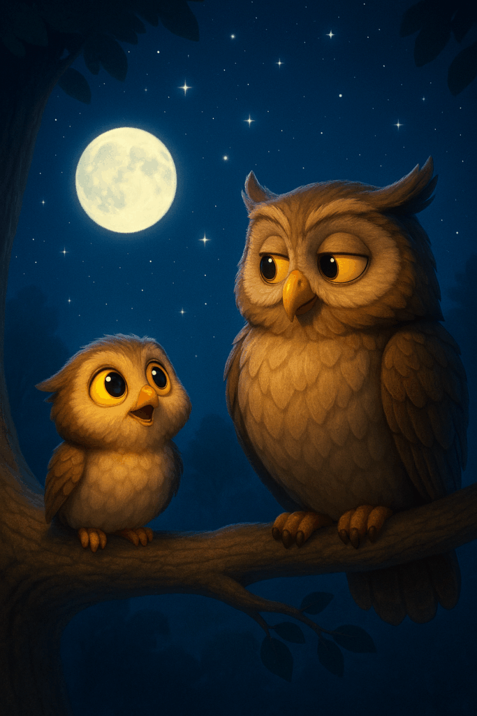 Másnap, amikor a csillagok ragyogtak, a kis bagoly próbát tett. Leszállt egy ágra, és a fejét oldalra billentve figyelte a bokrot. Apró mocorgást hallott – észrevette a kis egeret, akit más nem látott volna. A bagoly nem bántotta, csak nézte, és közben büszkén gondolta: