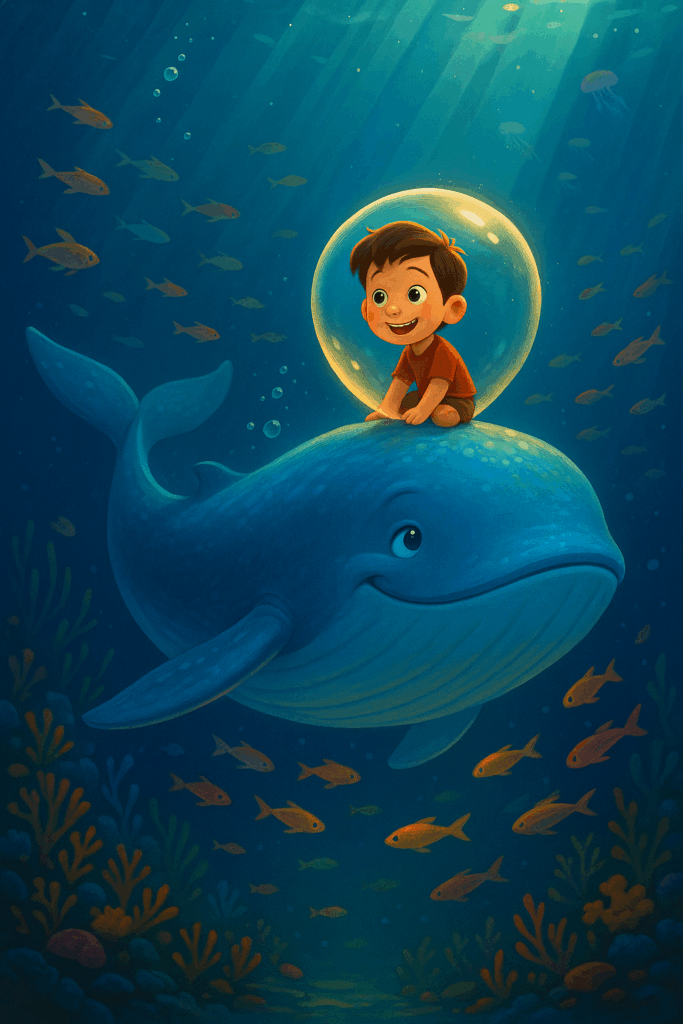 A bálna orrán keresztül egy puha, fénylő buborék emelkedett fel a levegőbe, és Balázs óvatosan belelépett. A buborék lassan a bálna hátára ereszkedett, és együtt merültek alá a tenger mélyére.