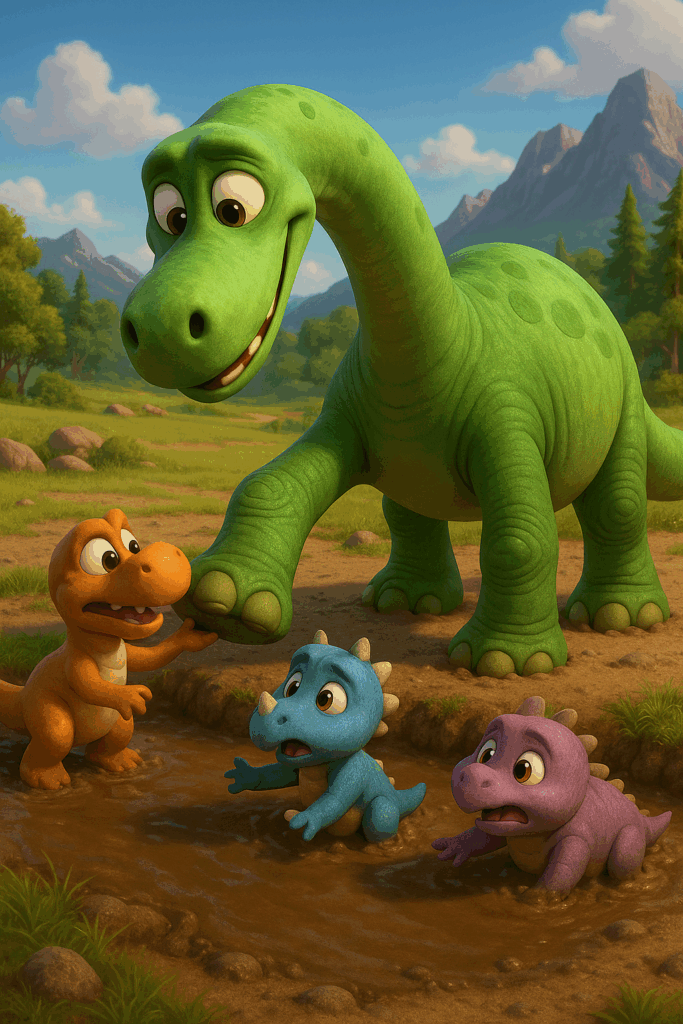 Egyik nap, amikor a völgybe nagy vihar tört, a kisebb dínók riadtan bújtak el. A folyó megáradt, és az ösvényeken sár hömpölygött.