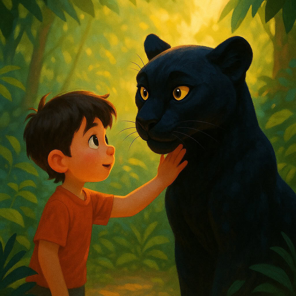 Az erdő mélyéről halk neszezés hallatszott. Balázs megfordult, és akkor meglátta – egy fekete párducot. A bundája olyan fényesen csillogott, mintha a csillagok maguk rajzolták volna rá az éjszakát.