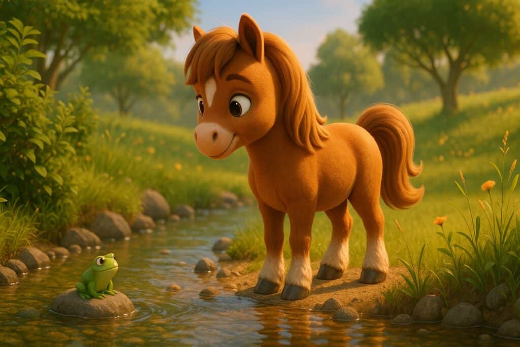 Egy virágos rét szélén, ahol a fűszálak táncoltak a szélben, élt egy apró, tarka póni, akit Panni-nak hívtak. Selymes bundája gesztenyebarna volt, a sörénye pedig aranyfényben csillogott, ha a nap rásütött.