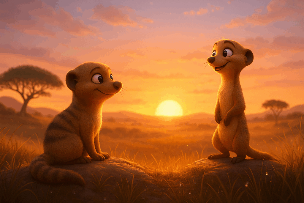 A két kis állat leült egymás mellé, és nézte, ahogy a fény lassan beteríti a világot. A madarak énekelni kezdtek, a szavanna ébredezett, és minden mozdulatban ott volt egy új nap ígérete.