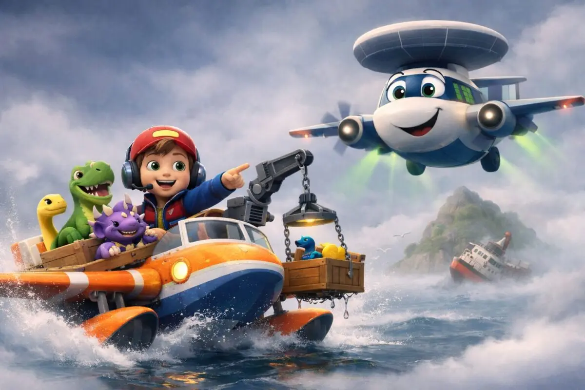 – Mesefa! – kiáltotta Balázs, miközben a repülőket a levegőbe dobta. – Ma nagy baj van! A dínók eltűntek a tengeren! Kell két hős, aki hazahozza őket!