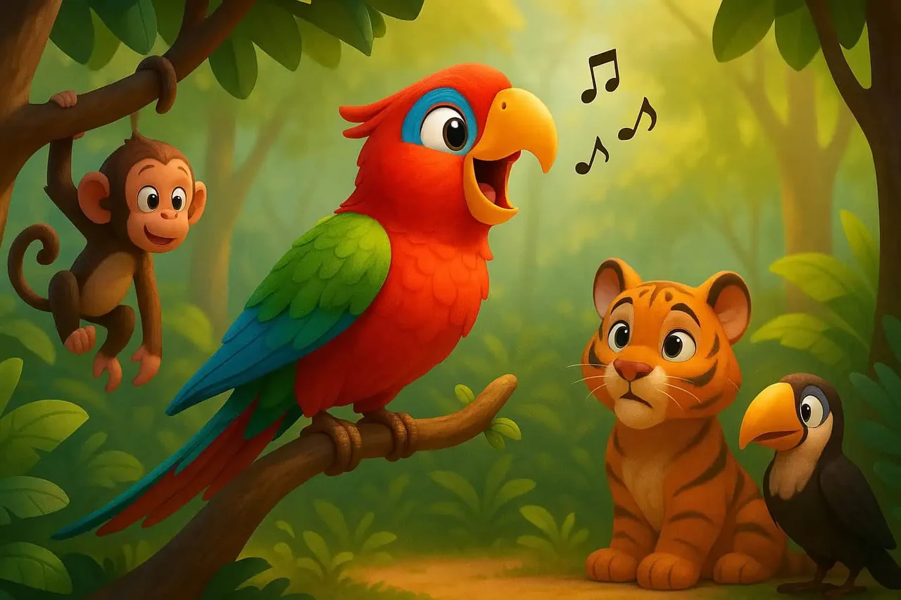 A trópusi erdőben élt egy fiatal papagáj. Tollai csillogtak a napfényben: piros, zöld, kék és sárga színek váltakoztak rajta, akár egy repülő virág. De hiába volt gyönyörű, egy dolog miatt szomorú volt: nem tudta utánozni a többieket.