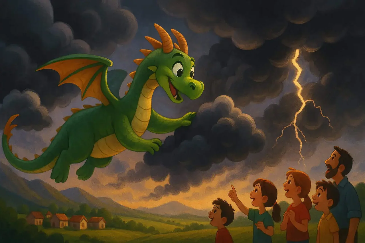 Egy napon azonban hatalmas vihar kerekedett. A fekete felhők egymást kergették, villámok cikáztak, a hegy lábánál egy apró falucska állt, benne a gyerekek riadtan bújtak össze. A vihar olyan erős volt, hogy a nagy sárkányok sem mertek közel menni.