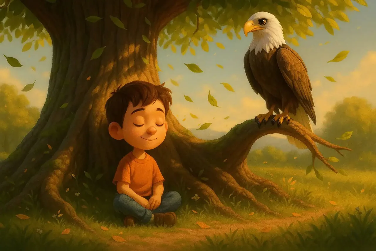 Egy délután Balázs a Mesefa tövében ült, ahogy már sokszor. Kezében egy kavicsot forgatott, de most nem kérdezett semmit. Csak nézett felfelé – az ég olyan mélykék volt, mintha a világ összes titka ott rejtőzne a felhők mögött.