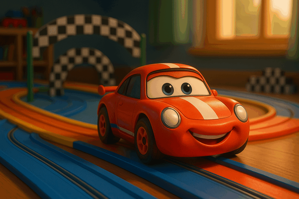 Valamikor régen, egy nagy játékszoba sarkában állt egy színes, csavaros, kacskaringós versenyautó-pálya. Volt ott mindene: éles kanyarok, hatalmas ugratók, spirálok, sőt, még egy miniatűr benzinkút is, ahol a kisautók „megpihenhettek”.