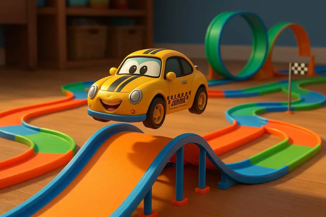 Valamikor régen, egy nagy játékszoba sarkában állt egy színes, csavaros, kacskaringós versenyautó-pálya. Volt ott mindene: éles kanyarok, hatalmas ugratók, spirálok, sőt, még egy miniatűr benzinkút is, ahol a kisautók „megpihenhettek”.