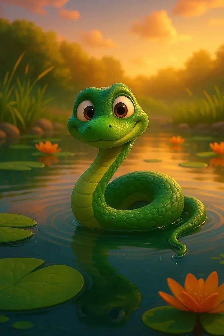 Egy csendes erdei tó partján élt egy kedves vízisikló, akit Lillának hívtak. Lilla békésen siklott a víz felszínén vagy épp a nádas között bújt el, de mindig mosolyra húzódott a szája, ha a napfény megcsillant pikkelyein.