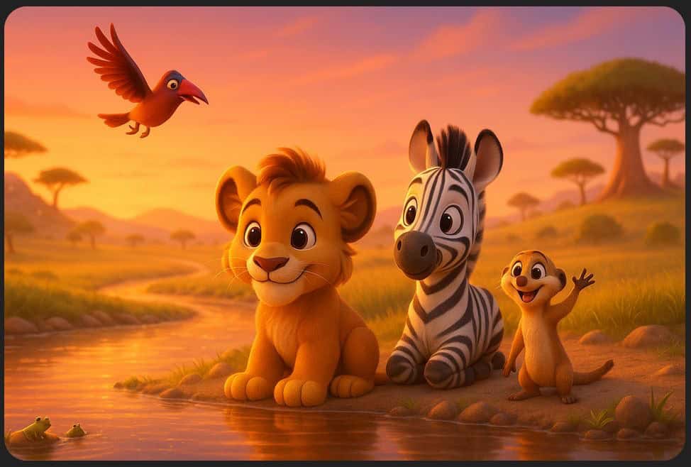 A szavanna közepén élt egy fiatal oroszlán, akit Liono-nak hívtak. Még nem volt hatalmas sörénye, de már próbálta eltanulni a felnőttek komoly járását. Minden nap figyelte a többi állatot: a zsiráfokat, amint a magas fákról legelésztek, vagy a zebracsapatot, ahogy csíkosan futottak át a mezőn.