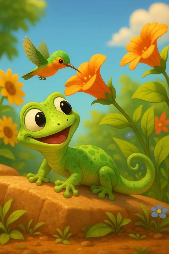 Egyik reggel, miközben a virágok között szaladt, különös dolgot vett észre: egy árnyék suhant el a feje fölött. Felnézett – és egy madár! De nem akármilyen! Ez egy kolibri volt, aki gyorsabban verdesett a szárnyaival, mint bármi, amit Guszti valaha látott.