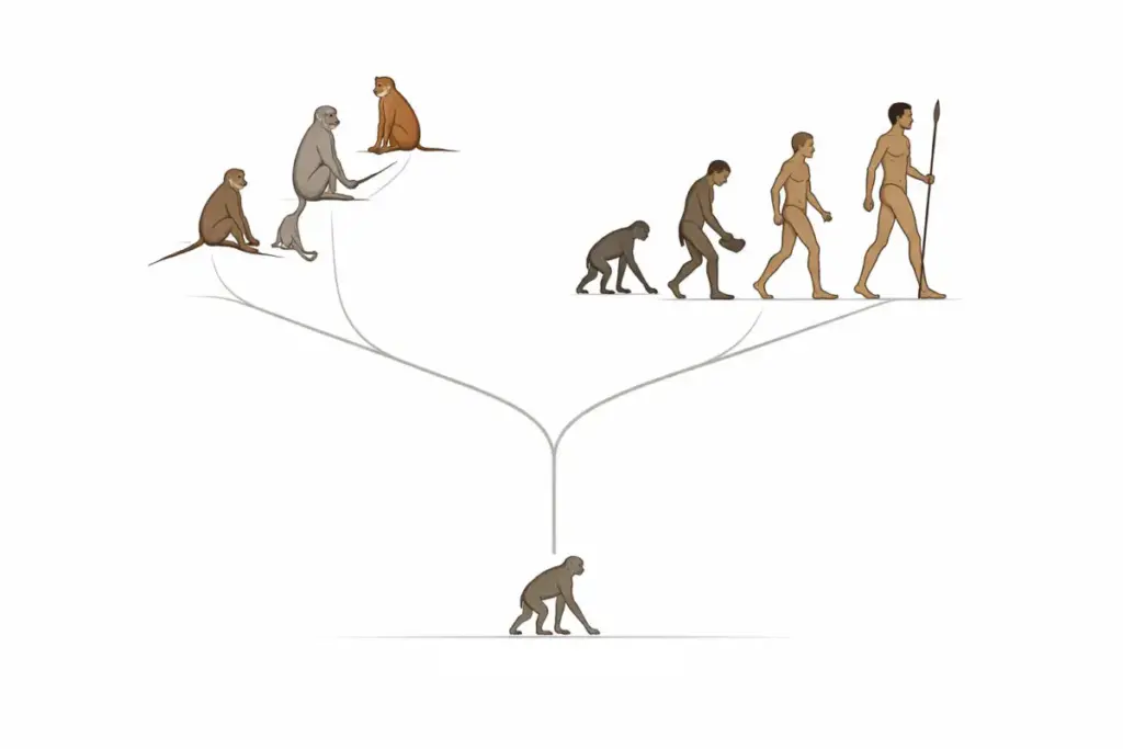 Az ember nem a ma élő majmokból fejlődött ki. Egy közös ősünk volt, amely több millió éve élt, és amelynek különböző csoportjai idővel eltérő irányba indultak.