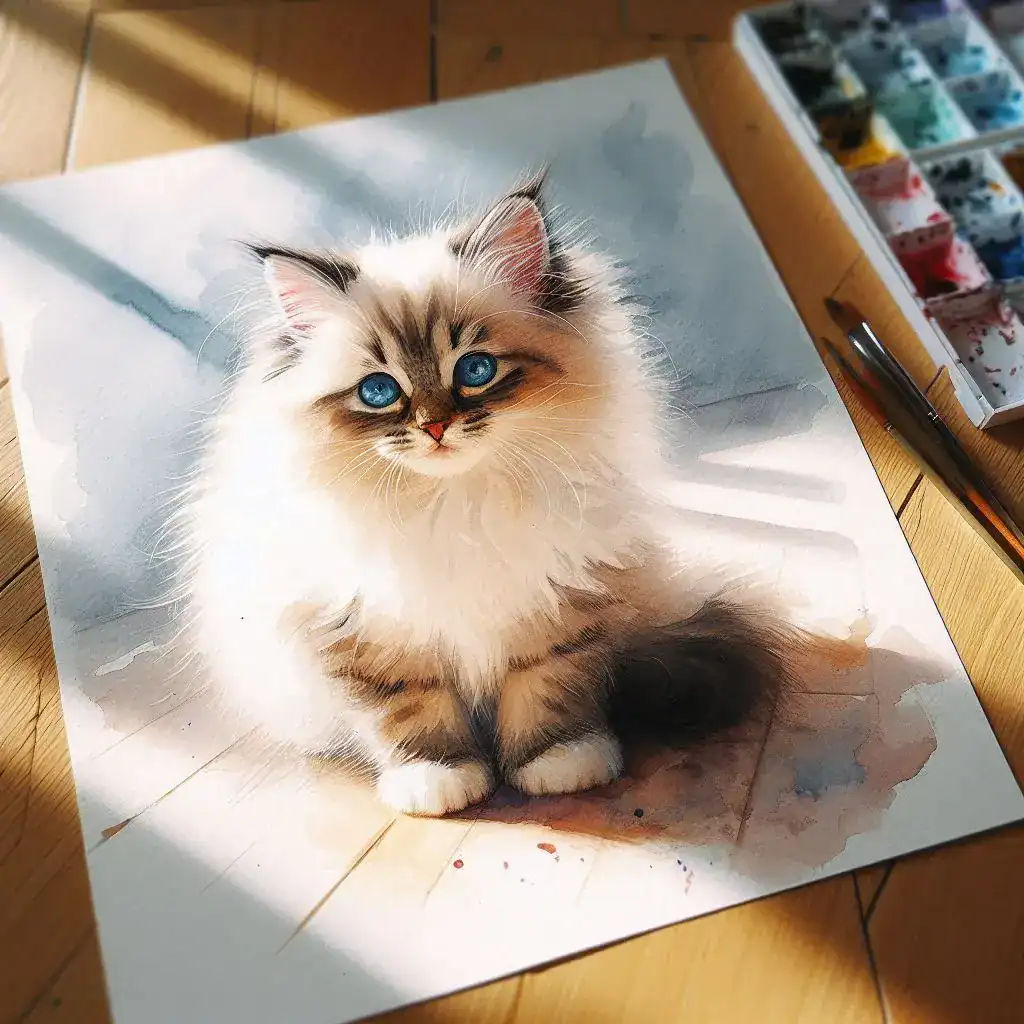 Az asztalon álló tiszta papírlapra hirtelen ecsetet emelt, és mire észbe kapott, egy kiscica alakja bontakozott ki. Bolyhos bundát festett neki, ragyogó kék szemeket és kíváncsi tekintetet. A festő végül letette az ecsetet, és sóhajtott: