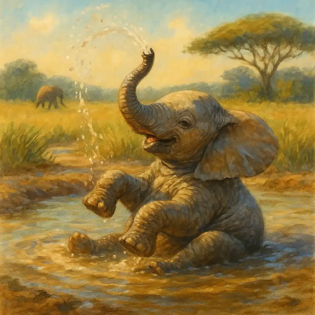 A poros bőrét hűs víz borította be. Először meglepődött, de aztán rájött — ez csodálatos érzés! Hamar megtanulta, hogyan lehet a vízben hemperegni, az iszapot magára dobni, és nagyokat spriccelni. A csorda örömmel figyelte, ahogy a kicsi egyre ügyesebb lett.