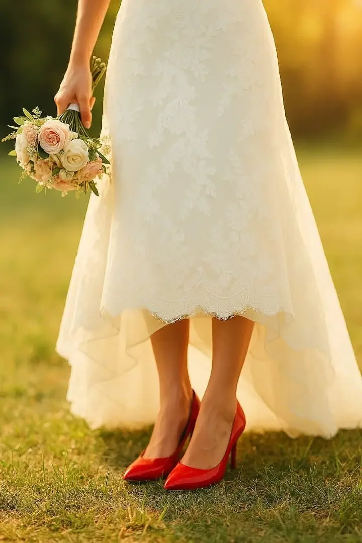 A piros a tűz, a szenvedély, a termékenység színe. Ez már nem a szűzi fehér ruha világa – hanem az „itt vagyok, mostantól asszony vagyok” üzenete.